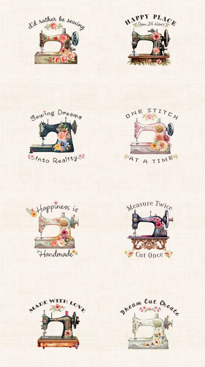 Description: This 24" panel is from the Happy Place collection for Timeless Treasures. This panel is great for quilting and home décor, and features affirmations surrounding florally decorated sewing machines on a cream colored background.