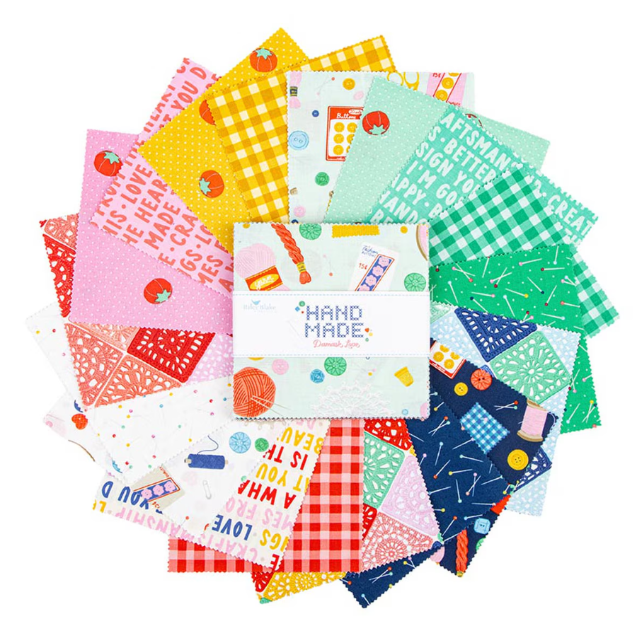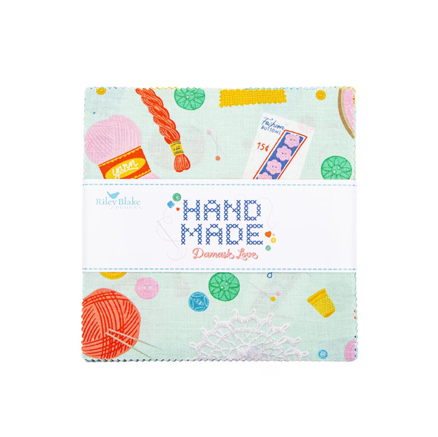 Description: This 5" stacker charm pack from the Hand Made collection by Amber Kemp-Gerstel for Riley Blake is great for quilting and home décor. It features 42 pieces of fabric with cartoony sewing tools and crochet designs on shades of green, blue, red, and yellow colored backgrounds. Each print may be included 1-2 times in the bundle.