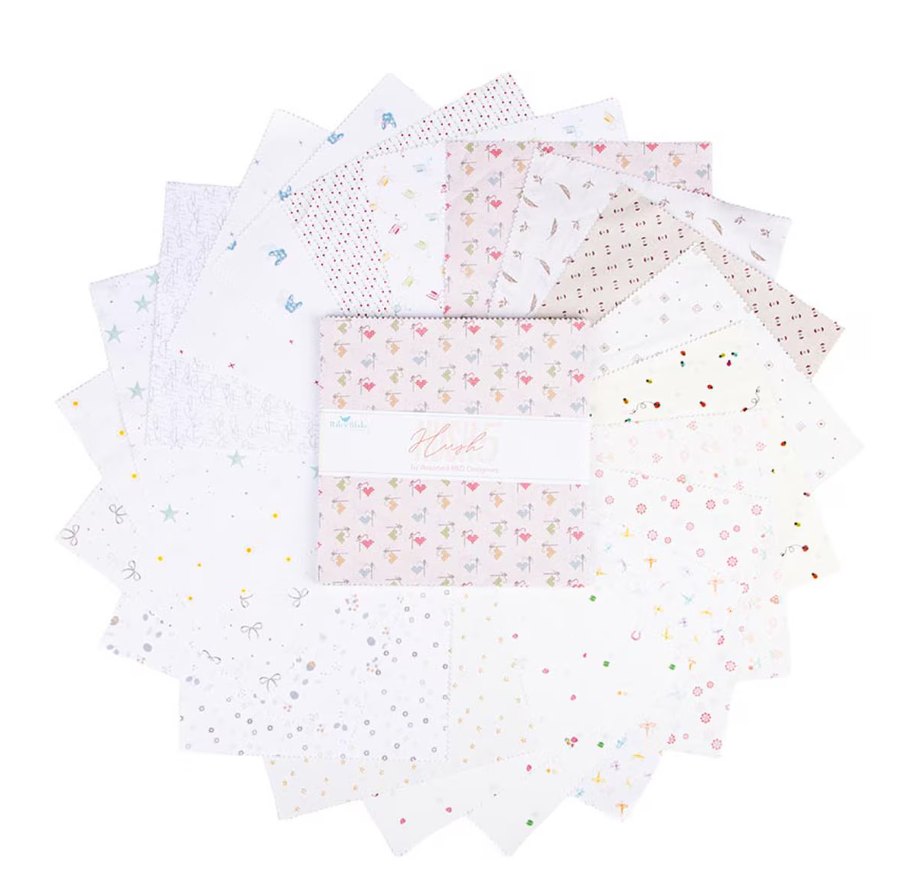 Description: This 10" stacker from the Hush Hush 5 collection for Riley Blake is great for quilting and home décor. It features 42 pieces of fabric with simple floral designs on white colored backgrounds. Each print may be included 1-2 times in the bundle.