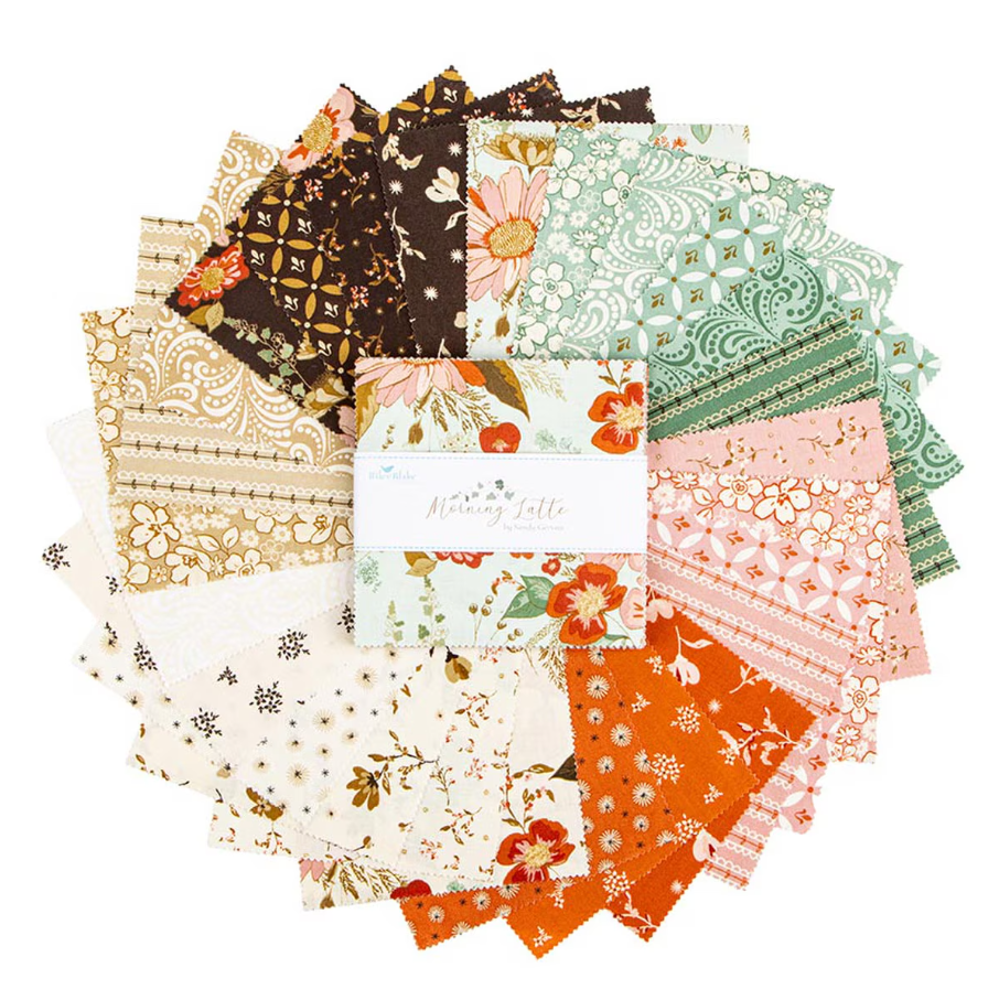 Description: This 5" stacker charm pack from the Morning Latte collection by Sandy Gervais for Riley Blake is great for quilting and home décor. It features 42 pieces of fabric with vintage styled floral patterns. Each print may be included 1-2 times in the bundle.